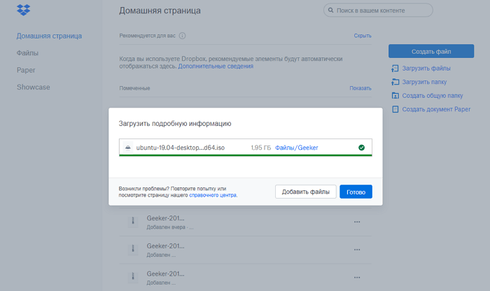 Dropbox дає можливість обмінюватися файлами і папками великого розміру, однак, при цьому доводиться думати про наявність достатнього вільного простору в хмарному сховищі. Втім, в безкоштовному тариф, відразу після реєстрації ви спокійно можете завантажити 2 Гб і створити посилання на скачування.