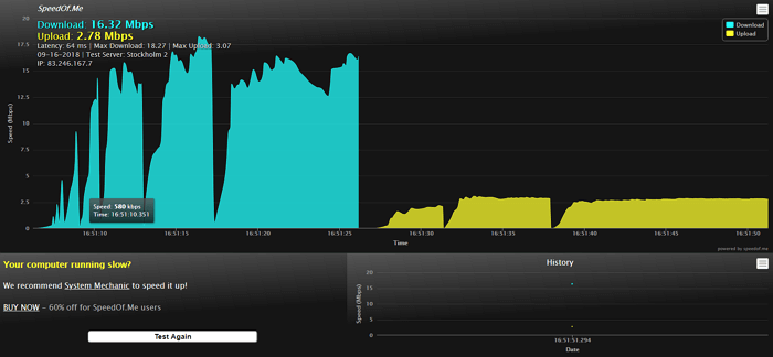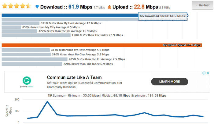 Загалом SpeedOf.Me — це кращий доступний тест на швидкість інтернету. Перевага його в тому, що він працює на технології HTML5, яка вбудована в браузер, тоді як плагіни Flash або Java вимагають установки. Це сприяє швидкої завантаження сайту і зниження навантаження на системні ресурси.