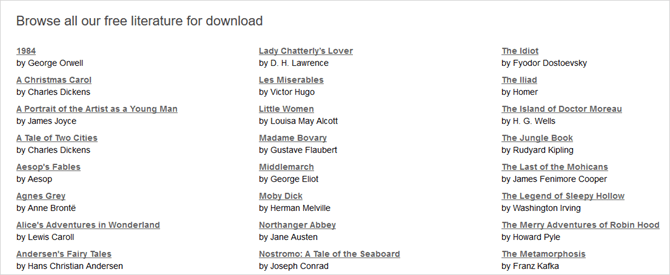 Книги на сайті можна завантажити у форматі PDF для читання в будь-який час. Таким чином, ви зможете, не відриваючись, насолоджуватися такими творами як «Грозовий перевал», «Повість про двох містах» або «Великі надії». Можливо, асортимент не так вже й великий, але якщо вам потрібен швидкий і простий спосіб знайти найкращий варіант, коли справа доходить до класики, то цей сайт для вас.