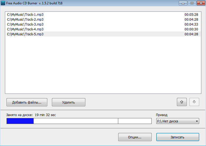 Якщо вам потрібна проста програма для створення аудіо компакт-дисків, то програма Free Audio CD Burner може бути хорошим варіантом. Вона дозволяє записувати диски для будь-якого музичного програвача, наприклад, музичного центру або магнітоли автомобіля. Для запису використовується движок IMAPI, вбудований в ОС Windows.