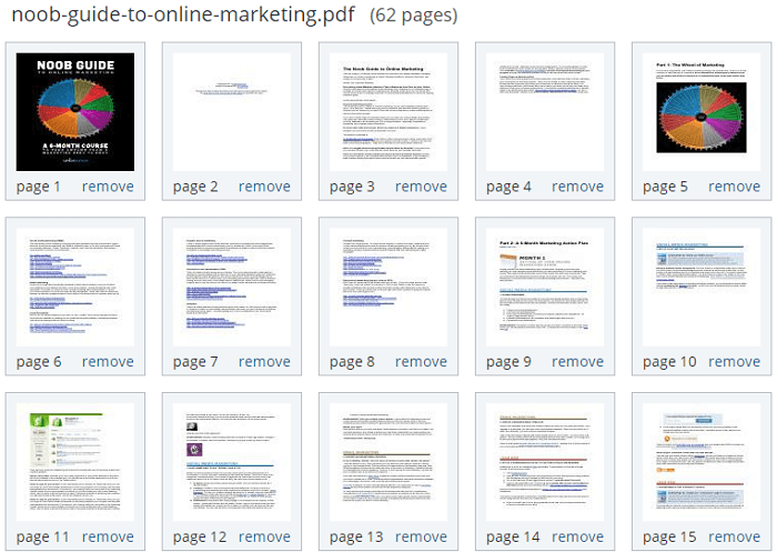 Завантажений файл відобразиться у вигляді акуратних ескізів, на кожному з яких з'явиться напис Remove. Клацнувши по ній, ви зможете видалити непотрібні сторінки. При завантаженні кількох PDF, всі вони будуть розташовуватися в одному вікні в порядку зростання – від меншої кількості сторінок до більшого.