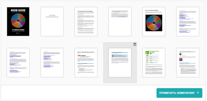 Всі сторінки завантаженого документа будуть представлені у вигляді мініатюр. Вам залишається тільки клацнути по значку у вигляді корзини для сміття, появляющемуся при наведенні покажчика миші на ескіз.