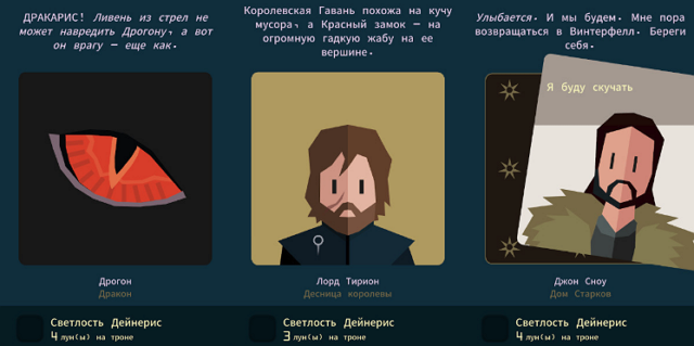 Reigns: Game of Thrones — проста карткова РПГ з тієї ж всесвіту, що й знаменитий телесеріал, в якій ви можете грати за одного з основних персонажів. Знайомтеся з оповіданням і вибирайте різні варіанти відповідей на поставлені запитання, щоб просуватися далі.