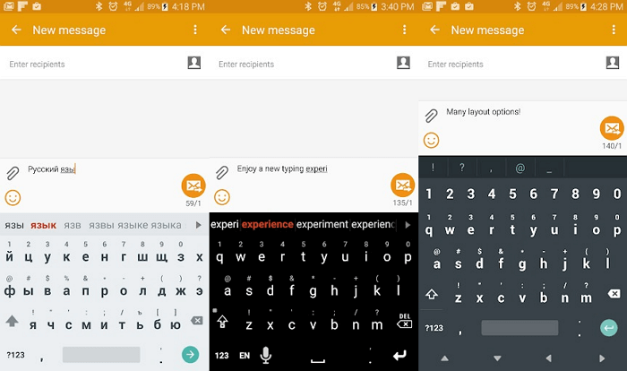 SwiftKey також підтримує жести для більш швидкого набору тексту. Якщо ви віддаєте перевагу «свайп» звичайному друкування, це додаток точно заслуговує уваги. Підтримується 300 мов світу, більш того – можлива одночасна робота відразу з 5 мовами. Власникам великого екрану смартфона або пальців рук, для більш зручної роботи може бути корисна можливість міняти не тільки розташування клавіатури на екрані, але і її розмір.