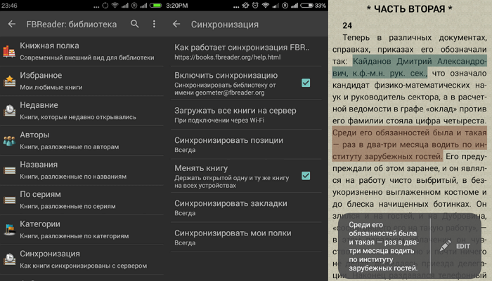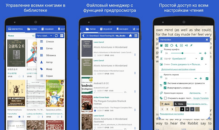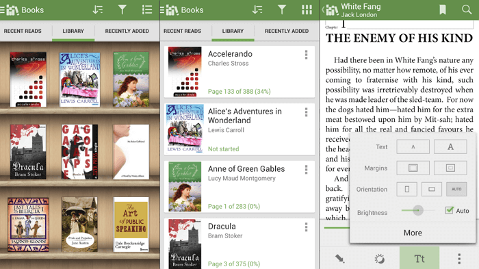 FBReader має підтримку AZW3, EPUB (до EPUB3), fb2, RTF, HTML і навіть текстових документів. Додаток використовує хмарний сервіс Google Диск для синхронізації книг між пристроями. Ще нам дуже сподобався інтерфейс. Він трохи старомодний, але приємний оку і простий у використанні. У нього навіть є підтримка жестів.