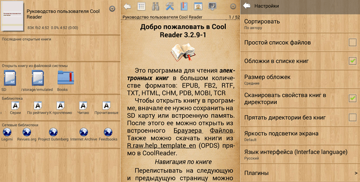 Cool Reader має привабливий інтерфейс, який має вигляд «зістареної паперу» з гарною анімацією перегортання. Є стандартні функції налаштування тексту. Підтримується безліч форматів, включаючи OPDS і LitRes. Вам може здатися, що додатком складно користуватися, але незабаром ви звикнете до нього.