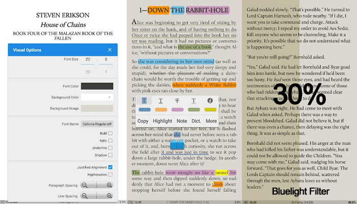 У ньому є підтримка найбільш поширених типів файлів, коміксів і навіть Adobe DRM, PDF. Ви можете виділити текст, експортувати замітки, заблокувати орієнтацію екрану і багато що інше. Існує підтримка OPDS для тих, кому вона необхідна.