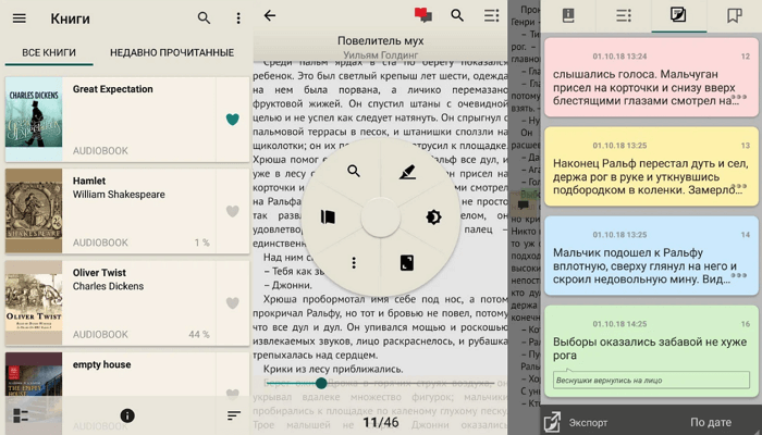 FReader підтримує більше десятка форматів файлів і навіть файли для MP3 аудіокниг. У вашому розпорядженні будуть чотири теми, що настроюються параметри читання, перекладач на п'ять мов і підтримку OPDS. Існує також переказ тексту в мову, хоча і досить посередній. Користувальницький інтерфейс досить хороший. Загалом, скаржитися нема на що.