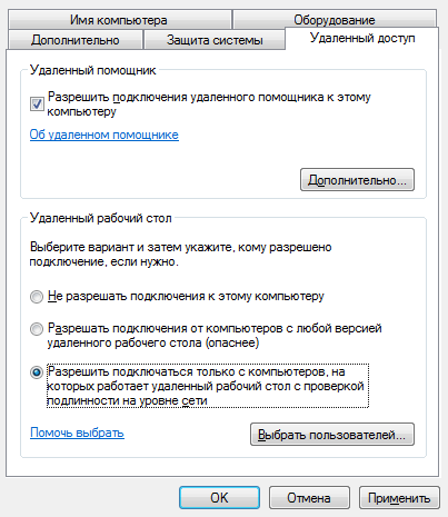 Поставте галочку «Дозволити підключення віддаленого помічника до цього комп'ютера». Ви можете задати параметр «Дозволити підключатися тільки з комп'ютерів, на яких працює робочий стіл з перевіркою на рівні мережі», а також створити список користувачів, яким відкриваєте доступ. У разі збоїв під час сеансу зв'язку, можна спробувати відключити аутентифікацію на рівні мережі.