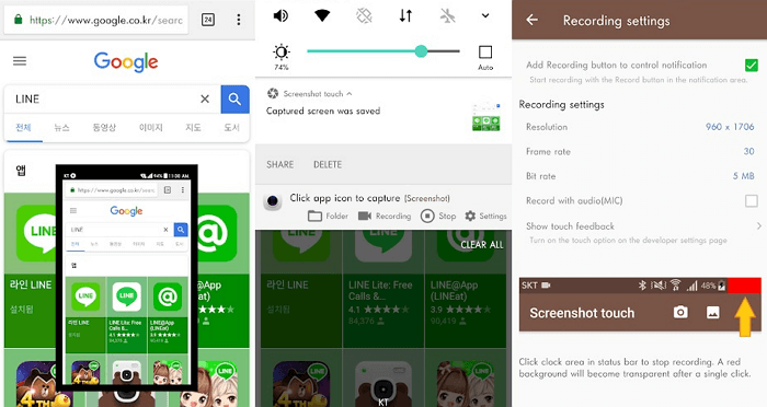 Ви можете зберегти картинку у форматі JPEG або PNG. І навіть зменшити її розмір, скориставшись параметром «Якість зображення». Скрін легко зробити за допомогою струшування і так само можна видалити рядок стану. На сторінці налаштувань запису змінюється частота кадрів, дозвіл і швидкість передачі. Панель в області сповіщень є заставкою в режимі реального часу. Звідти ви отримуєте доступ до всього додатком.