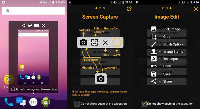 При запуску програми є опції для зняття скріншотів, відеозапису, редагування зображень і налаштування. Ви можете струсити пристрій для зняття screenshot. Існує опція віджета для створення зручного ярлика. При захопленні потрібної області ви можете попросити утиліту видалити рядок стану, панель функціональних клавіш.