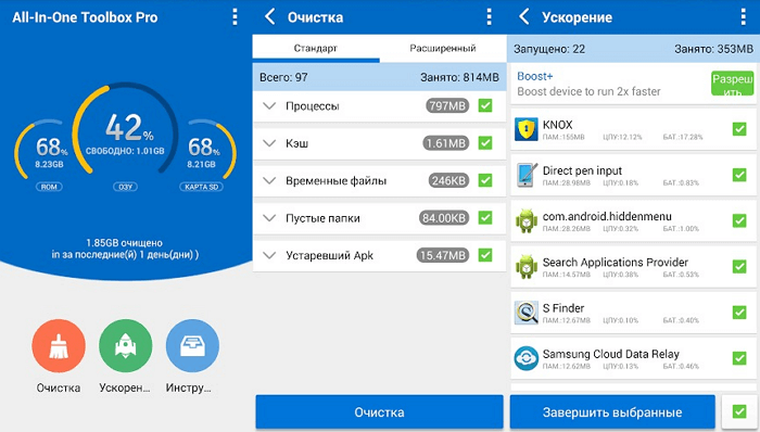 Опція One-Tap Boosting вAll-in-one Toolbox дозволяє одним натисканням очищати фонові програми, кеш і оперативну пам'ять. Додаткові функції включають охолодження процесора, прибирання сміття, установку і видалення декількох програм одночасно, підвищену швидкість завантаження, допомога в резервному копіюванні, можливість блокування софта для більшої конфіденційності, виявлення додатків з дуже великою кількістю реклами, підвищення продуктивності ігор.