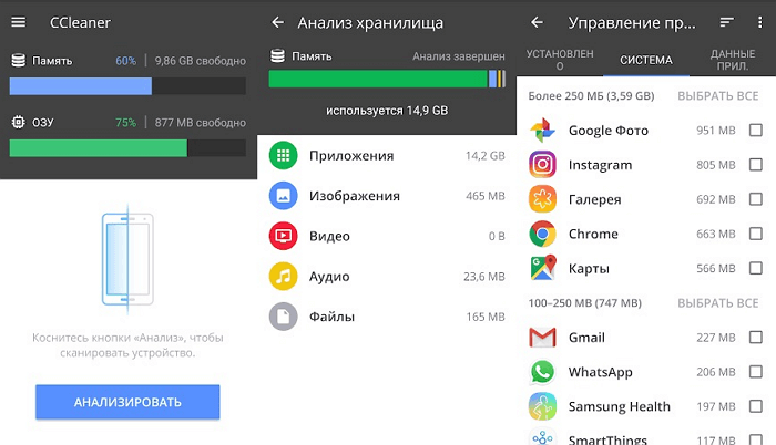 CCleaner — дуже продуманий інструмент, який очищає папки завантаження, кеш додатків, історію браузера, буфер обміну і т. д. Він пропонує варіанти, коли справа доходить до видалення SMS-повідомлень і журналів викликів (видалення всіх або окремих пунктів, конкретного контакту або давно використовуються).