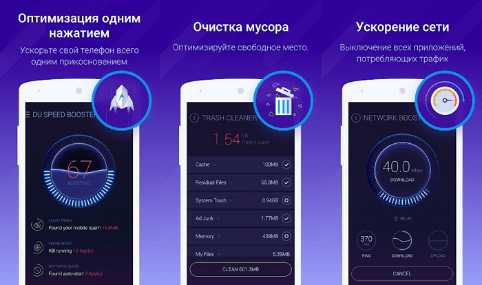 DU Speed Booster — виявляє програми, що працюють у фоновому режимі, і «вбиває» їх, щоб звільнити ОЗУ, очистити кеш і небажані файли, а також захистити пристрій від вірусів. Володіючи 230 мільйонами користувачів і рейтингом в 4,5 зірки, DU може захистити дані функцією блокування додатків. Програму легко використовувати — потрібно лише одне натискання кнопки, розташованої прямо на головному екрані.