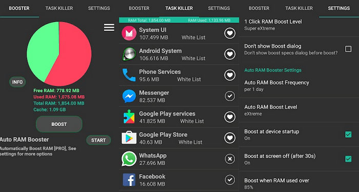 RAM Boosterдопомагає звільнити оперативну пам'ять, виключивши будь-які процеси, що перешкоджають роботі у фоновому режимі, і зберегти рівень батареї. RAM Booster простий і безкоштовний. Процес запускається за допомогою натискання на одну кнопку.
