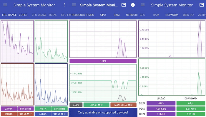 Simple System Monitor — ідеально підходить для візуалів, показуючи графіки використання ЦП, ОЗП і активності жорсткого диска. Simple System Monitor включає такі інструменти, як очищення кеша і файловий менеджер. Пристрої з ОС Android Oreo, на жаль, обмежили доступ до статистики процесора, тому майте це на увазі, якщо використовуєте 8.0 і вище.