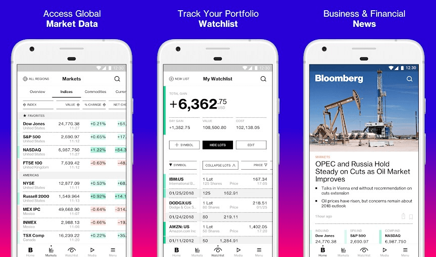 Додаток Bloomberg дозволяє вам оперативно дізнаватися про найсвіжіші новини фінансового світу. Воно легко налаштовується. Ви можете самі вибрати тип інформації для отримання. Доступно створення власного інвестиційного портфеля.