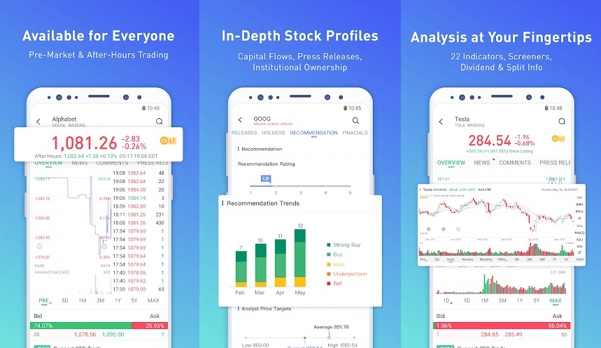 Webull— це глобальний постачальник даних про трейдинге і розробник одного з кращих додатків. Ця програма допоможе вам відстежувати зміни на фондовому ринку, вивчати біржові індекси, котирування акцій і Forex. Є можливість читати актуальні фінансові новини в окремій вкладці. Доступна синхронізація з обліковим записом Google Finance. Це допоможе краще спостерігати за інвестиційним портфелем. В наявності є 22 технічних індикатора (наприклад, MA, EMA, BOLL, MACD, KDJ).