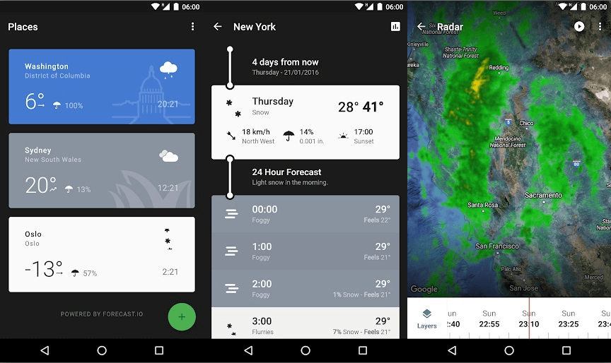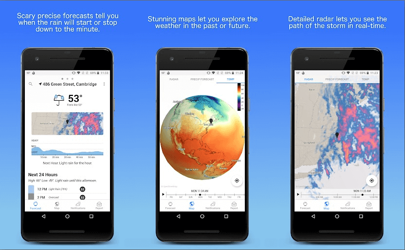 Dark Sky— спірне додаток для цього списку, але воно залишається одним з найулюбленіших на протязі довгого часу у багатьох користувачів. Сильна сторона цього додатка — це щохвилинний прогноз погоди, який дає потрібну інформацію у простому вигляді. Наприклад, програма попереджає, що дощ почнеться через 13 хвилин, а не дає абстрактне передбачення про те, що будуть опади.