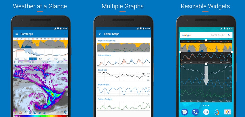 У додатку є єдиний екранний віджет, який показує графік дощу, вітру, температури, тиску і висоту хвиль. Додаток є безкоштовним, але в ньому є вбудовані покупки, якщо ви хочете прибрати рекламу.