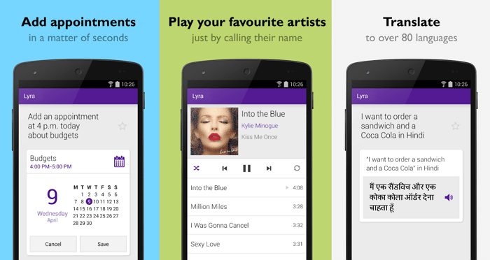 Lyra — голосовий помічник також англійською мовою, чудово справляється з базовими завданнями. Інтерфейс програми не такий гарний, як у деяких інших програм з цього списку, однак зі своєю роботою Lyra справляється непогано. Починаючи з пошуку відео на YouTube і завершуючи прогнозами погоди, асистент виконує все, що потрібно користувачеві. А ще Lyra вміє встановлювати будильник і нагадування, робити нотатки, а також переводити слова і вирази. На жаль, немає підтримки російської мови.