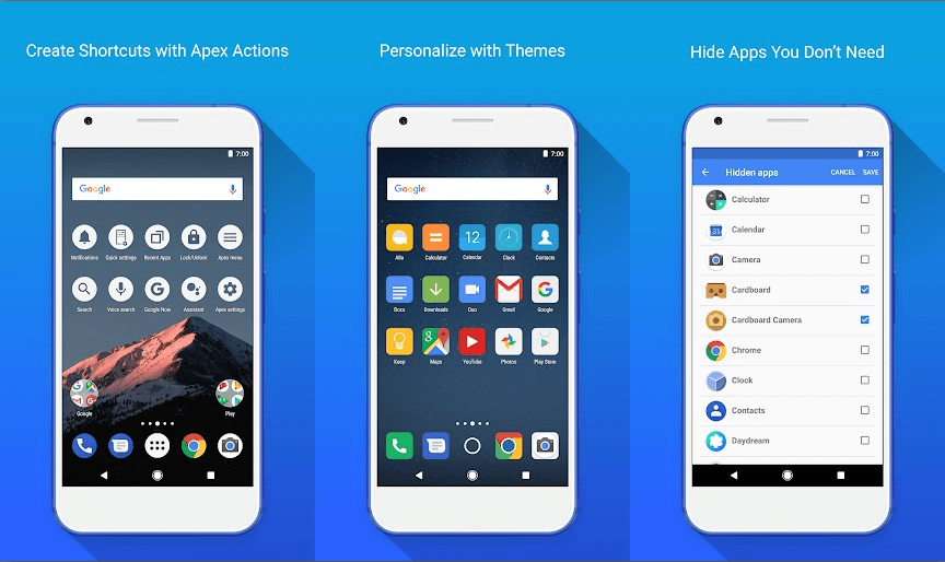 Apex Launcher відомий вже давно і залишається одним з найпопулярніших лаунчер. Подібно додатком Action Launcher, він призначений для гнучкого налаштування інтерфейсу з кількома додатковими функціями, наприклад, можна сховати форму пошуку від Google, рядок стану і навіть док-станцію, до речі у якій можуть відображатися до семи значків, замість чотирьох! Якщо у вас є дитина, то вам буде корисна функція блокування робочого столу для запобігання випадкових змін.