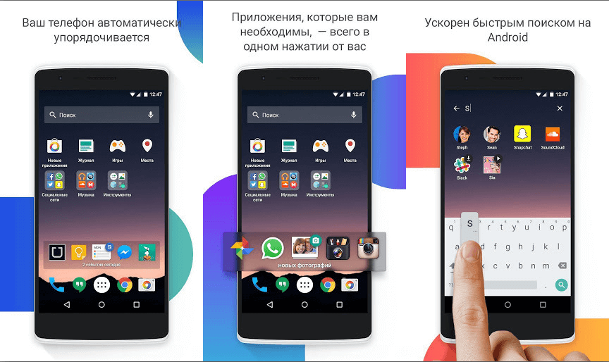 При першому ж запуску лаунчер спробує автоматично розкласти вже встановлені програми по відповідним папкам, таким як «Гри», «Музика», «Соціальні мережі» та «Новини». Ви можете створювати нові «Розумні папки» в будь-який час, групуючи додатки за своїм розсудом.