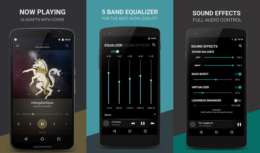 PlayerPro Music Player— у нього красивий інтерфейс, який дозволяє використовувати скіни, які ви можете завантажити. Є підтримка відтворення відео, п'ятисмуговий еквалайзер, різні звукові ефекти, віджети і цікаві функції, такі як струшування телефону для перемикання треку. Додаток навіть підтримує музику Hi-Fi (до 32 біт, 384 кГц).