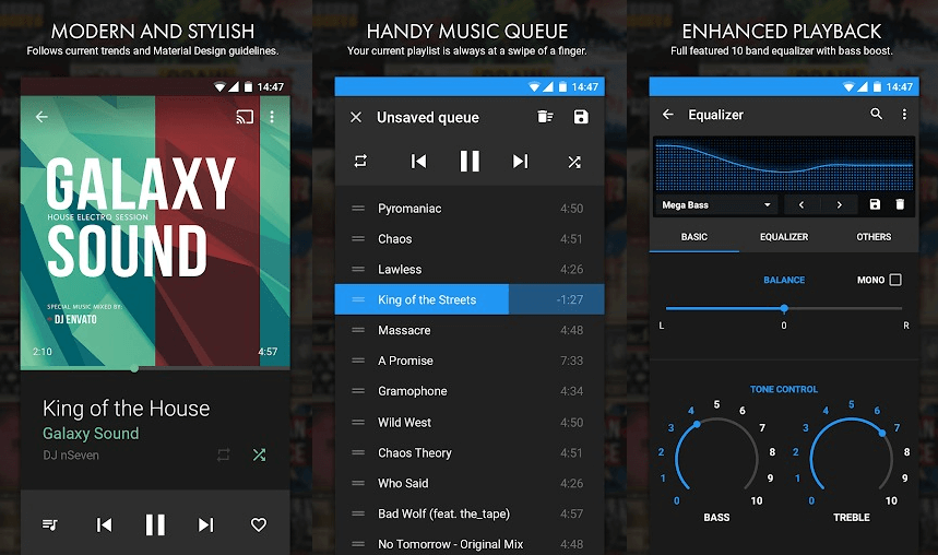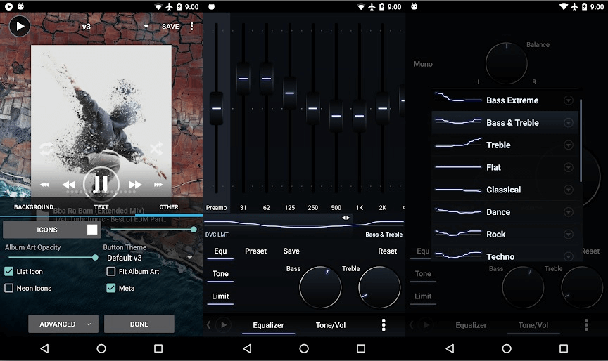 BlackPlayer – простий, але елегантний плеєр, який працює з вкладками, і ви можете налаштувати їх так, щоб використовувати тільки ті, які вам дійсно потрібні. Підтримує формати MP3, WAV, OGG, FLAC і ряд інших. Оснащений функцією посилення басів і вбудованим еквалайзером, хоча при бажанні ви можете підключити зовнішній. Таймер сну дозволяє налаштувати автоматичне відключення після тривалої бездіяльності. Доступно редагування ID3-тегів пісень, виконавців і альбомів.