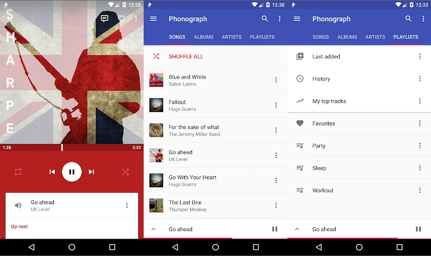 Phonograph— заявлено як просте, легке і зрозуміле у використанні додаток. У нього інтерфейс Material Design, який володіє відмінним зовнішнім виглядом. При бажанні ви можете змінити тему. Поряд з цим, ви отримаєте інтеграцію з last.fm, редактор тегів, функцію списку відтворення, віджет для головного екрану і функцію навігації. Це дуже простий і хороший варіант для тих, хто хоче слухати свою музику без будь-яких складнощів.