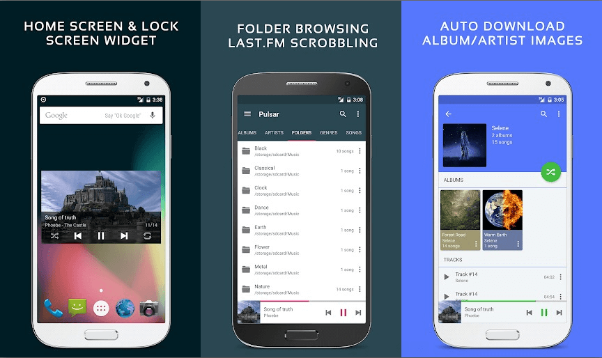 Pulsar – це, мабуть, кращий безкоштовний музичний плеєр на сьогоднішній день. Він включає в себе красивий Material Design, редагування тегів, програвання без інтервалів, інтелектуальні плейлисти, таймер сну і скробблінг Last.fm.