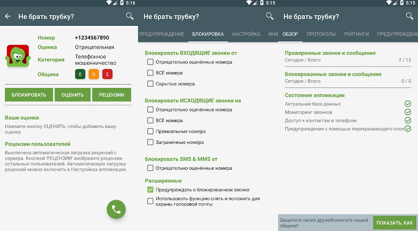 Дане ПЗ може замінити стандартну дзвонилку телефону. До складу програми входить велика і регулярно оновлювана база даних телефонних номерів, які беруть участь у шахрайських схемах і розсилають спам. Користувач може бачити, що йому надходить дзвінок або SMS-повідомлення з підозрілого номери, але може і повністю блокувати небажані номери і контакти. Відмінне універсальне додаток! Регулярно оновлюється і завжди працює, як годинник!
