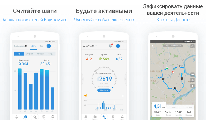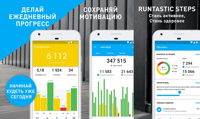 Runtastic Steps вважатиме активні хвилини, витрачені на прогулянки, кількість кроків, витрачені калорії. Є налаштування щоденних цілей. Вартість Runtastic Premium починається зі 180 рублів на місяць. Безкоштовна версія досить хороша, але краще витратитися на преміум. У платній версії відкриється безліч нових можливостей, таких як визначення маршрутів, планування раціону, ведення щоденника харчування та багато іншого.