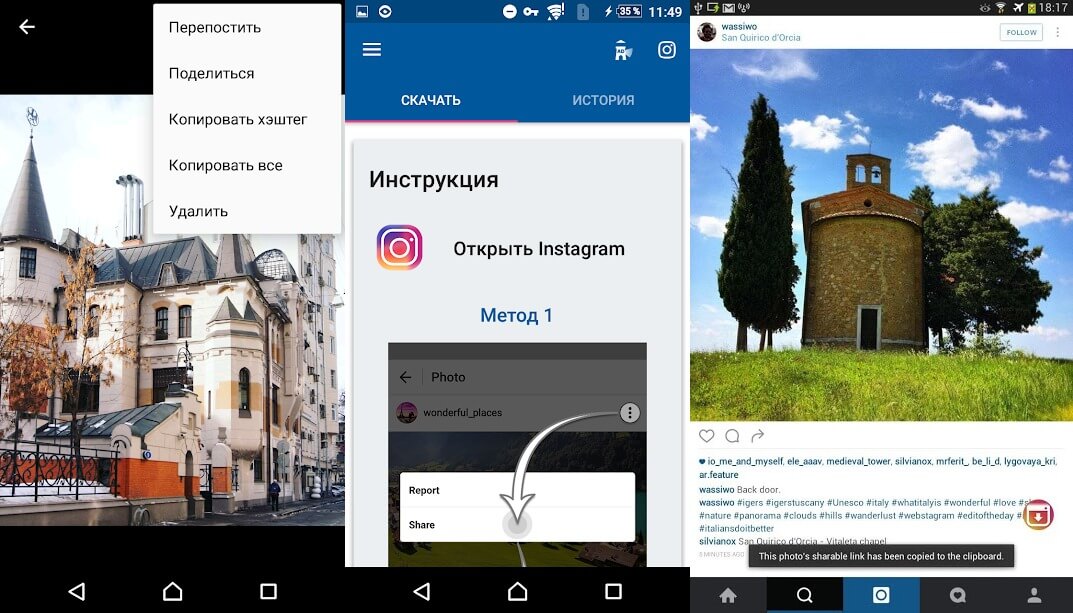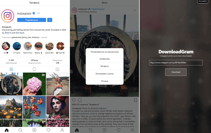 Відкрийте Instagram, знайдіть фото, яке ви хочете завантажити і натисніть на значок у вигляді трьох точок, виберіть пункт меню «Копіювати посилання». Залишилося тільки відкрити сайт DownloadGram і вставити скопійоване посилання у відповідне поле. Все, після того, як ви натиснете кнопку Download — потрібна фотографія завантажується на комп'ютер або телефон.