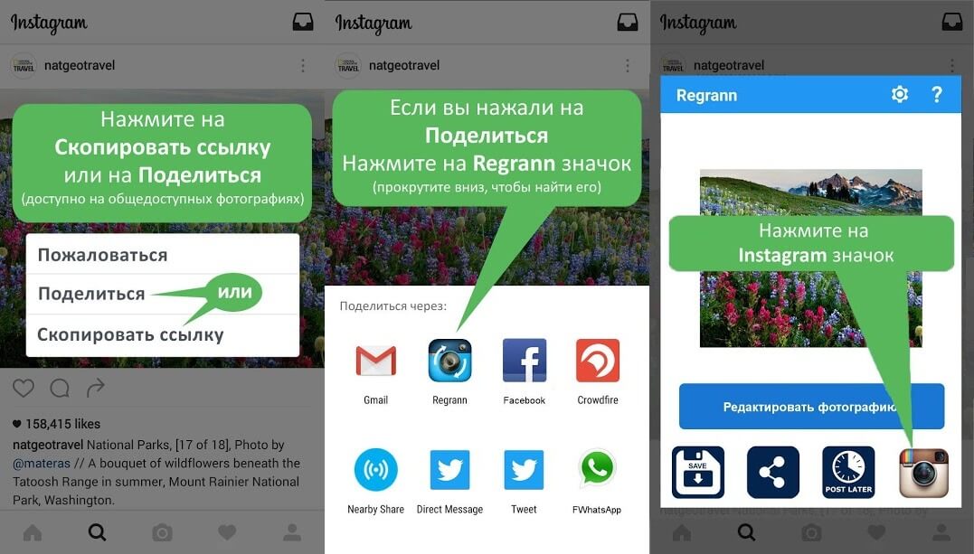 Regrann допомагає швидко зберігати фотографії з Instagram, що знаходяться в загальному доступі. Приватні фото, захищені налаштуваннями приватності, скачати не вдасться: для цього потрібно отримати дозвіл від користувача, який виклав контент.