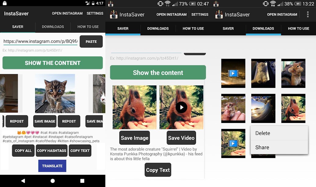 Головна особливість Saver Reposter — копіювання хэштегов і повного опису фотографій і відео, що дозволяє зробити отримані файли більш інформативними. При бажанні можна зберігати тільки хештегі або опис.