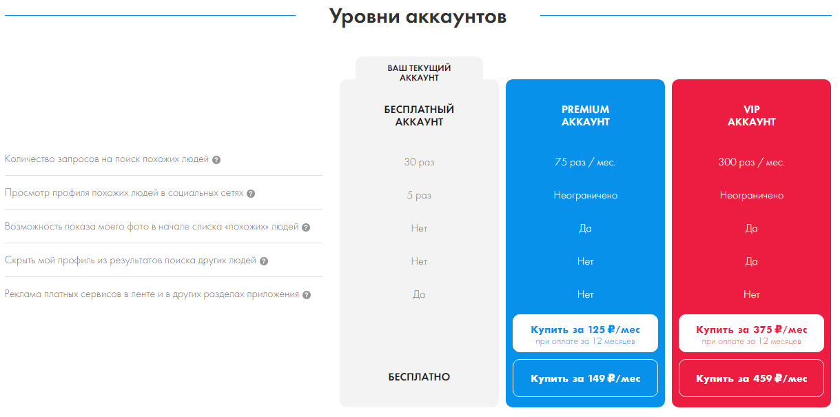 На записі Premium, вартістю 149 рублів в місяць, ви зможете кожні 30 днів розшукувати до 75 осіб, піднімати свою фотографію в початок списку «схожих» людей, отримувати інші комерційні пропозиції від сервісу Findface.
