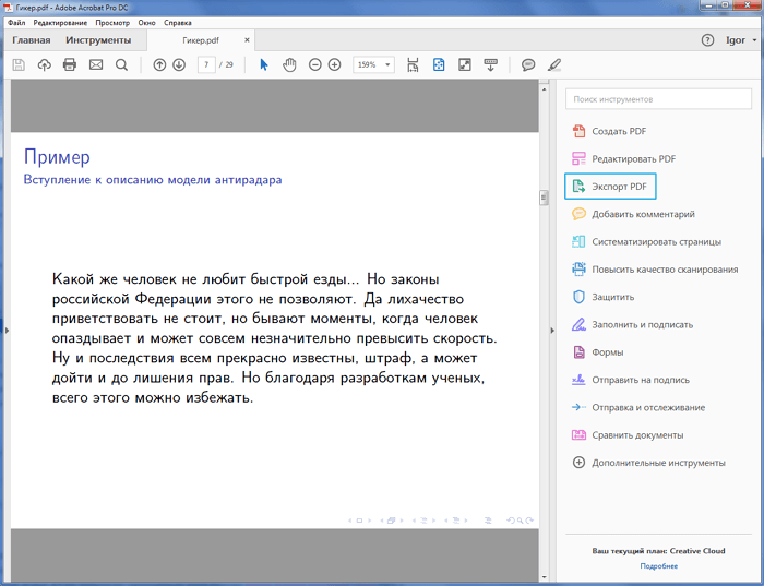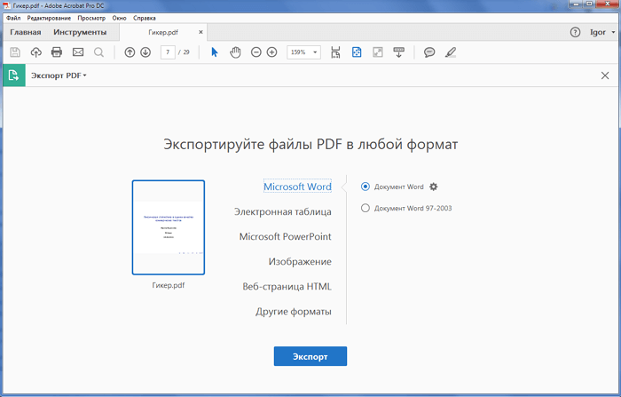 Відкрийте PDF-файл в Adobe Acrobat. На панелі праворуч клацніть по пункту «Експорт PDF».