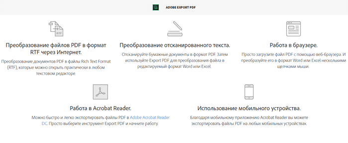 На сьогоднішній день кращі умови для обробки PDF-файлів пропонують інструменти компанії Adobe. Якраз вона і створила цей формат. Adobe пропонує платне веб-додаток Adobe Acrobat Exporter Onlineза 1500 рублів на рік, а також програму для Mac OS X, iOS, Windows і Linux. Доступна конвертація в DOC, RTF або навіть Excel.