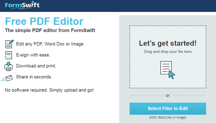 FormSwift— безкоштовний онлайн-конвертер PDF в Word з цікавими доповненнями. На перший погляд сайт виглядає так само, як і багато інші, схожі за призначенням. Дозволяє вносити зміни в документи з подальшим збереженням у формат PDF, DocX. Створивши безкоштовну обліковий запис, ви зможете відправляти результати по електронній пошті своїм друзям і діловим партнерам.