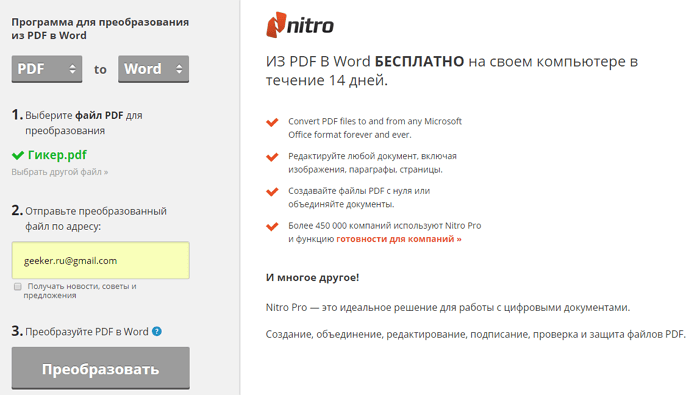 Nitro PDF to Word — цей конвертер відішле готовий Word файл на ваш email. Дана функція може бути корисна для бізнесу або навчання при спільній роботі над проектами. Відмінно підходить для текстового уривку, але не для фрагментів з великою кількістю зображень. У безкоштовної версії діє ліміт на розмір файлу, що завантажується в 5 Мб. Доступно п'ять перетворень в місяць.