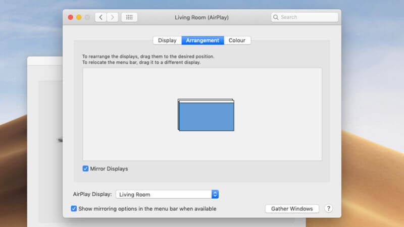 Якщо іконка не відображається або ви хочете щось налаштувати, пройдіть по такому шляху: Меню Apple → Системні параметри → Монітори. Тут ви зможете почати трансляцію зображення на телевізор або використовувати його в якості додаткового робочого столу (для цього перейдіть на вкладку «Розташування»). Встановіть прапорець «Показати параметри в рядку меню, якщо доступно» для постійного відображення іконки AirPlay на панелі.