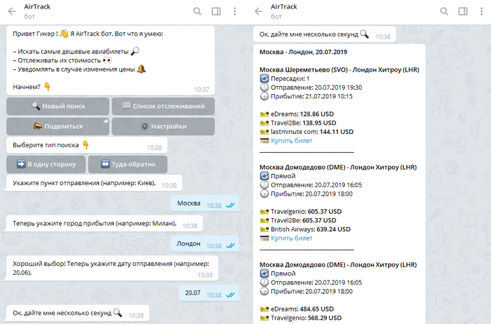 З допомогою AirTicket можна забронювати навіть міжнародні квитки за кілька кліків. Крім покупки квитків, AirTicket відстежує ціни і повідомляє користувачів про зміни. Бот розуміє багато мов: він уточнює країну, національну валюту і шукає квитки у кращих операторів за найнижчими цінами. Після завершення пошуку відображається назва аеропорту з якого відбувається виліт, дата надіслання, а також кількість пересадок.