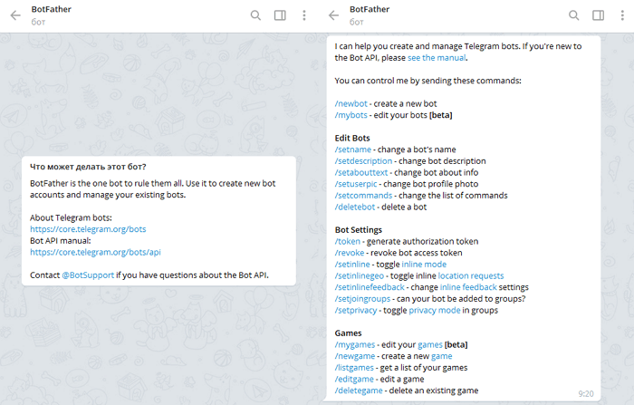Саме BotFather допоможе вам створити власного бота або налаштувати вже існуючого. Він дуже простий у використанні — натисніть на кнопку пуск і слідуйте інструкції. Щоб створити нового бота просто введіть команду /newbot.
