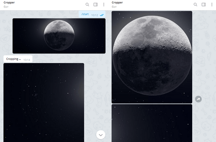 Instagram сумно відомий своїми правилами співвідношення сторін фотографії. Наприклад, якщо ви завантажите панорамне зображення, то в вашому профілі буде тонка лінія, де не можна буде нічого розгледіти. Cropper Bot дозволяє розділити зображення на квадратні ділянки, а потім опублікувати їх як альбом. Просто завантажте панорамне фото в вікно чату, і ви миттєво отримаєте готові до публікації зображення.