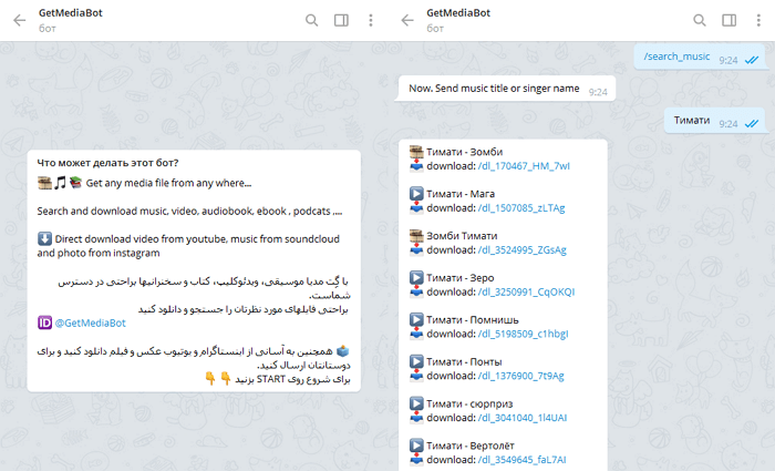 Якщо пошук музичних треків, сцен з фільмів, трейлерів і текстів пісень був для вас проблемою, тоді цей крутий бот для вас. З GetMediaBot все перераховане буде зібрано в одному місці. GetMediaBot дозволяє не тільки переглядати відео, слухати музику онлайн, але і викачувати файли в потрібному як на смартфон. Щоб почати пошук, просто відправте команду /start.