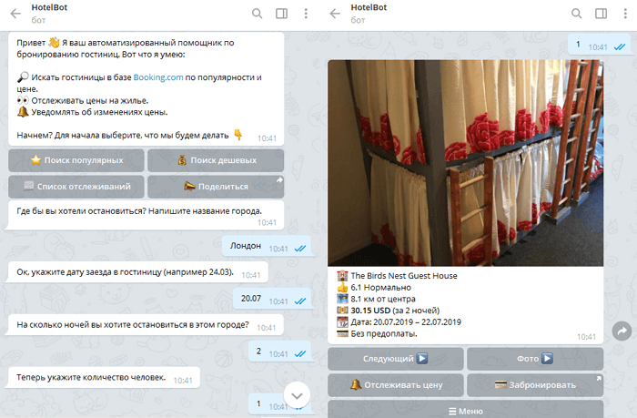 Плануєте відпустку, але не знаєте, де зупинитися? Просто збирайте валізи, а всі інші клопоти довірте боту HotelBot. Він підтримує російську мову і знаходить кращі готелі, доступні в місті прибуття. Ще він здатний відсортувати готелі за ціною/популярності, щоб підібрати підходящий саме для вас варіант.