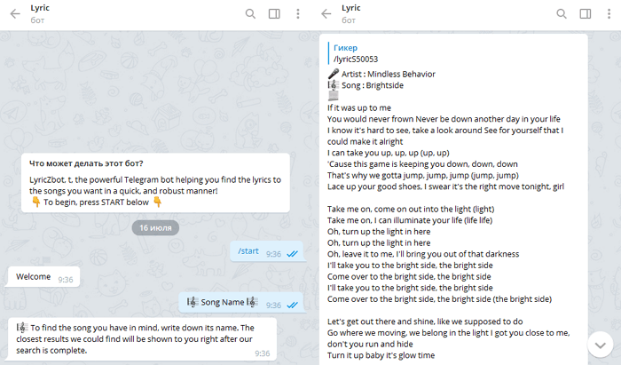 Багатьом подобається підспівувати при прослуховуванні музики. А що якщо ви слухаєте круту пісню, але не розумієте текст? Присядьте і розслабтеся, вас врятує Lyric. Цей бот знайде для вас тексти будь-яких композицій. Більше того: Lyric видасть результати не тільки за назвою, але і за рядками пісні. Не пам'ятаєте назву? Не біда – наберіть знайомі слова і Lyric покаже відповідні варіанти.