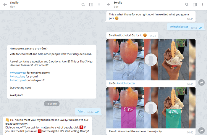 Схема використання Swelly досить проста: показується дві картинки по обраному хештегом і потрібно проголосувати за одну з них (A або B). Після цього відображається статистика, яка показує скільки процентів користувачів обрало певний варіант. Це можна використовувати, наприклад, у рекламі, щоб показувати саме те, що найбільше подобається користувачам інтернету.