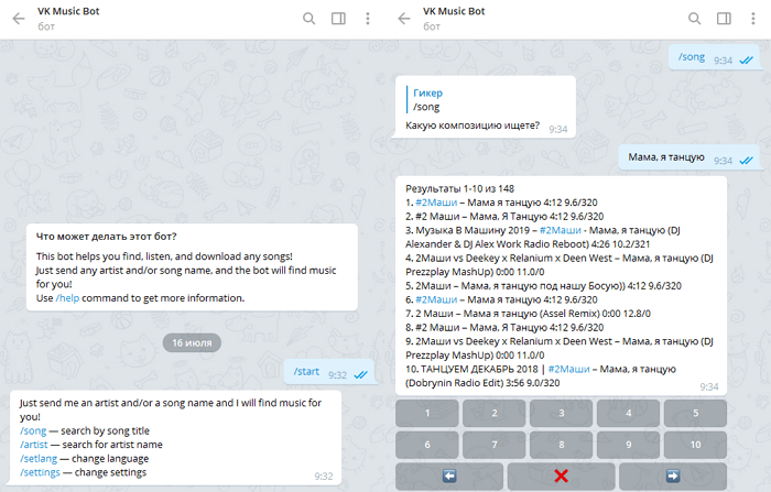 Telegram – справжня знахідка для меломанів. Він навіть здатний замінити інші сервіси прослуховування музики. Додайте в список контактів VK Music Botі ви зможете знаходити треки за назвою та виконавцю. Якщо буде декілька варіантів (до 10 штук), то з'явиться список з відповідними кнопками для вибору потрібного треку.